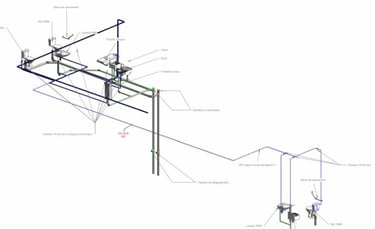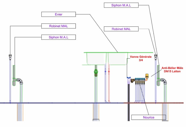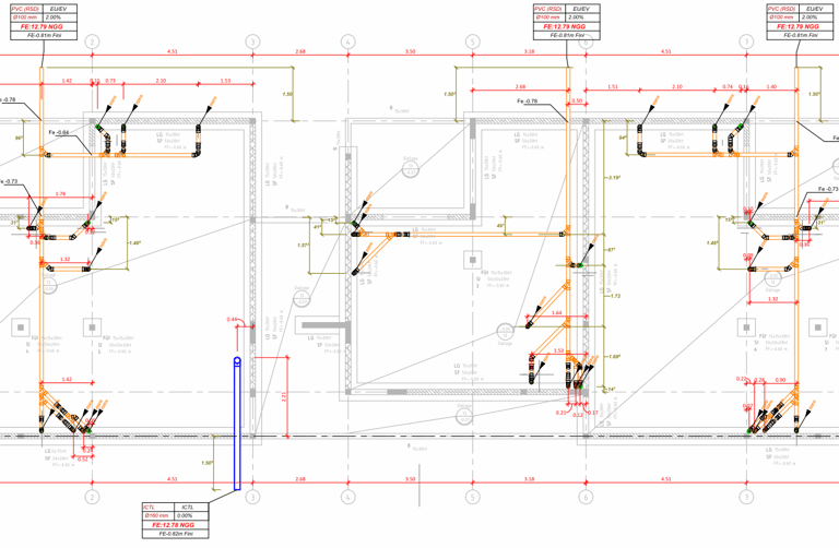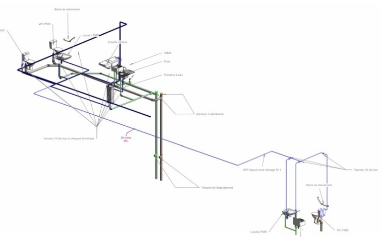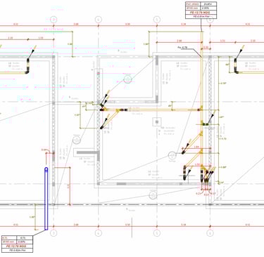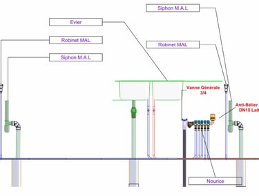Sur l'image vous pouvez observer un exemple typique de notre travail ,un plan détaillé de réseaux de plomberie comprenant les éléments essentiels :