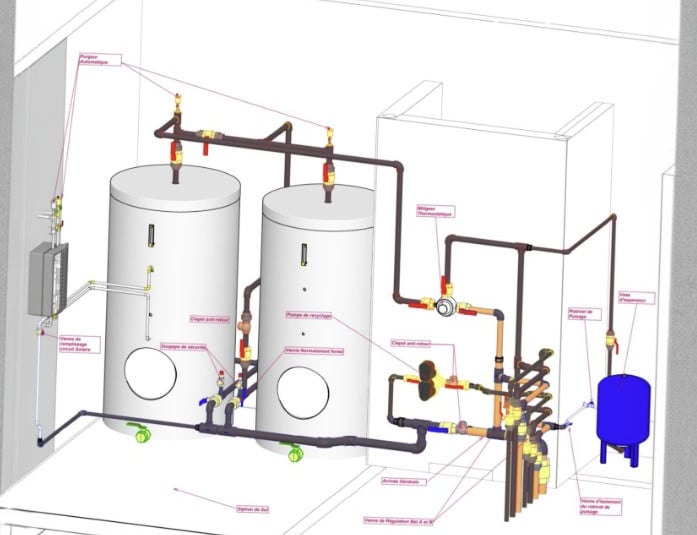 Conception 3D & 2D d’un système de production ECS avec ballons de stockage et régulation thermique.